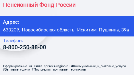 Пенсионный Фонд России по адресу 633209, Новосибирская область, Искитим, Пушкина, 39а в дальнейшем Организация, размещена в следующих категориях: