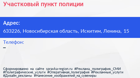 Участковый пункт полиции по адресу 633226, Новосибирская область, Искитим, Ленина, 15 в дальнейшем Организация, размещена в следующих категориях: