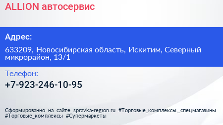 ALLION, автосервис по адресу 633209, Новосибирская область, Искитим, Северный микрорайон, 13/1 в дальнейшем Организация, размещена в следующих категориях: