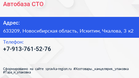 Автобаза, СТО по адресу 633209, Новосибирская область, Искитим, Чкалова, 3 к2 в дальнейшем Организация, размещена в следующих категориях: