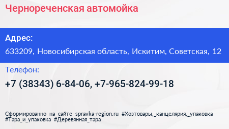 Чернореченская, автомойка по адресу 633209, Новосибирская область, Искитим, Советская, 12 в дальнейшем Организация, размещена в следующих категориях: