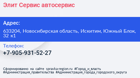 Элит Сервис, автосервис по адресу 633204, Новосибирская область, Искитим, Южный Блок, 32 к1 в дальнейшем Организация, размещена в следующих категориях: