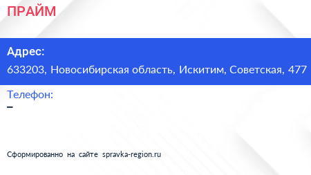ПРАЙМ по адресу 633203, Новосибирская область, Искитим, Советская, 477 в дальнейшем Организация, размещена в следующих категориях: