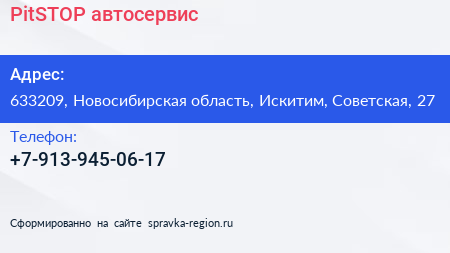 PitSTOP, автосервис по адресу 633209, Новосибирская область, Искитим, Советская, 27 в дальнейшем Организация, размещена в следующих категориях: