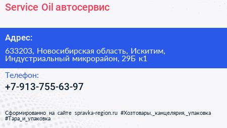 Service Oil, автосервис по адресу 633203, Новосибирская область, Искитим, Индустриальный микрорайон, 29Б к1 в дальнейшем Организация, размещена в следующих категориях: