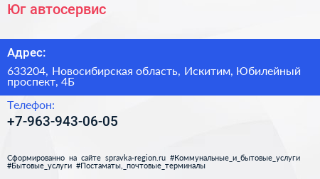 Юг, автосервис по адресу 633204, Новосибирская область, Искитим, Юбилейный проспект, 4Б в дальнейшем Организация, размещена в следующих категориях: