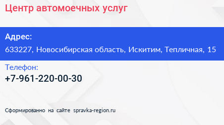 Центр автомоечных услуг по адресу 633227, Новосибирская область, Искитим, Тепличная, 15 в дальнейшем Организация, размещена в следующих категориях: