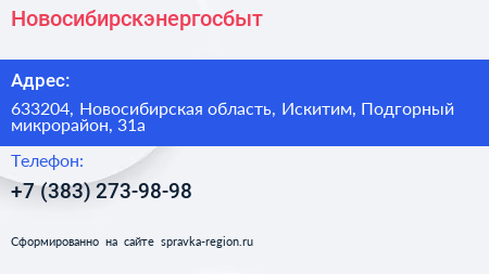 Новосибирскэнергосбыт по адресу 633204, Новосибирская область, Искитим, Подгорный микрорайон, 31а в дальнейшем Организация, размещена в следующих категориях: