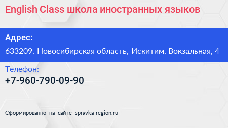 English Сlass, школа иностранных языков по адресу 633209, Новосибирская область, Искитим, Вокзальная, 4 в дальнейшем Организация, размещена в следующих категориях: