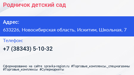 Родничок, детский сад по адресу 633226, Новосибирская область, Искитим, Школьная, 7 в дальнейшем Организация, размещена в следующих категориях: