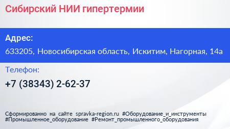 Сибирский НИИ гипертермии по адресу 633205, Новосибирская область, Искитим, Нагорная, 14а в дальнейшем Организация, размещена в следующих категориях:
