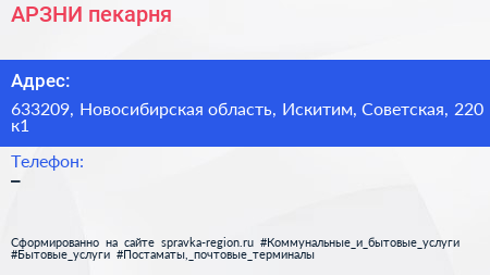 АРЗНИ, пекарня по адресу 633209, Новосибирская область, Искитим, Советская, 220 к1 в дальнейшем Организация, размещена в следующих категориях: