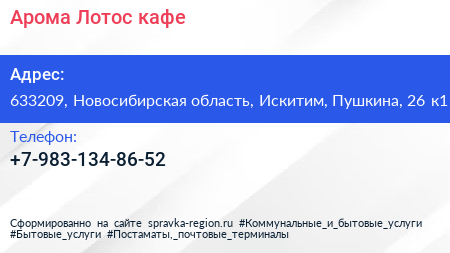 Арома Лотос, кафе по адресу 633209, Новосибирская область, Искитим, Пушкина, 26 к1 в дальнейшем Организация, размещена в следующих категориях: