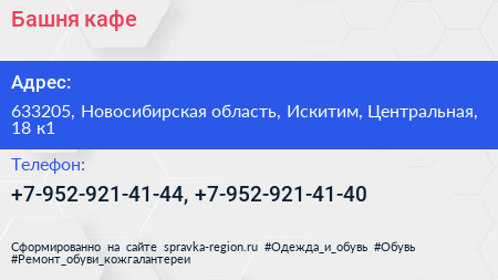 Башня, кафе по адресу 633205, Новосибирская область, Искитим, Центральная, 18 к1 в дальнейшем Организация, размещена в следующих категориях: