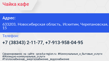Чайка, кафе по адресу 633203, Новосибирская область, Искитим, Черепановская, 15 в дальнейшем Организация, размещена в следующих категориях: