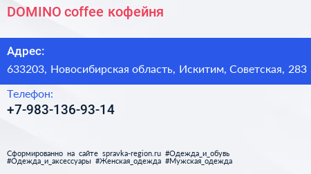 DOMINO coffee, кофейня по адресу 633203, Новосибирская область, Искитим, Советская, 283 в дальнейшем Организация, размещена в следующих категориях: