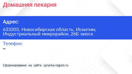 Домашняя, пекарня по адресу 633203, Новосибирская область, Искитим, Индустриальный микрорайон, 26Б киоск в дальнейшем Организация, размещена в следующих категориях: