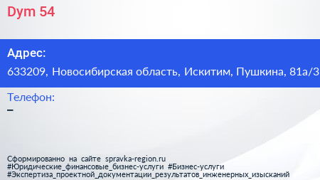 Dym 54 по адресу 633209, Новосибирская область, Искитим, Пушкина, 81а/3 в дальнейшем Организация, размещена в следующих категориях: