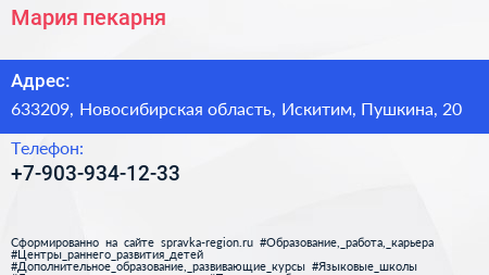 Мария, пекарня по адресу 633209, Новосибирская область, Искитим, Пушкина, 20 в дальнейшем Организация, размещена в следующих категориях: