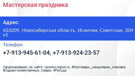 Мастерская праздника по адресу 633209, Новосибирская область, Искитим, Советская, 204 к1 в дальнейшем Организация, размещена в следующих категориях: