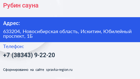 Рубин, сауна по адресу 633204, Новосибирская область, Искитим, Юбилейный проспект, 1Б в дальнейшем Организация, размещена в следующих категориях: