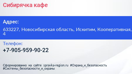 Сибирячка, кафе по адресу 633227, Новосибирская область, Искитим, Кооперативная, 4 в дальнейшем Организация, размещена в следующих категориях: