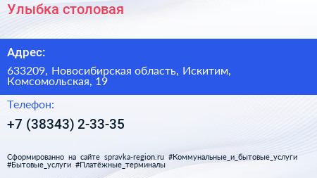 Улыбка, столовая по адресу 633209, Новосибирская область, Искитим, Комсомольская, 19 в дальнейшем Организация, размещена в следующих категориях: