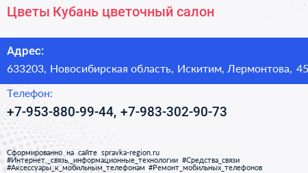 Цветы Кубань, цветочный салон по адресу 633203, Новосибирская область, Искитим, Лермонтова, 45 в дальнейшем Организация, размещена в следующих категориях: