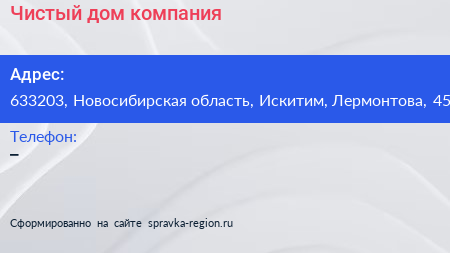 Чистый дом, компания по адресу 633203, Новосибирская область, Искитим, Лермонтова, 45 в дальнейшем Организация, размещена в следующих категориях: