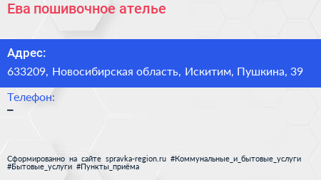 Ева, пошивочное ателье по адресу 633209, Новосибирская область, Искитим, Пушкина, 39 в дальнейшем Организация, размещена в следующих категориях: