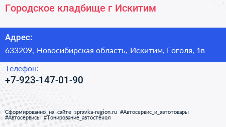 Городское кладбище, г. Искитим по адресу 633209, Новосибирская область, Искитим, Гоголя, 1в в дальнейшем Организация, размещена в следующих категориях:
