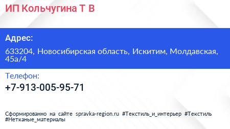 ИП Кольчугина Т.В. по адресу 633204, Новосибирская область, Искитим, Молдавская, 45а/4 в дальнейшем Организация, размещена в следующих категориях: