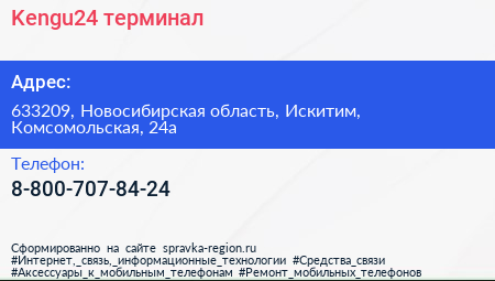 Kengu24, терминал по адресу 633209, Новосибирская область, Искитим, Комсомольская, 24а в дальнейшем Организация, размещена в следующих категориях: