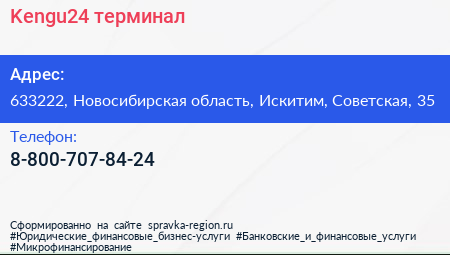 Kengu24, терминал по адресу 633222, Новосибирская область, Искитим, Советская, 35 в дальнейшем Организация, размещена в следующих категориях: