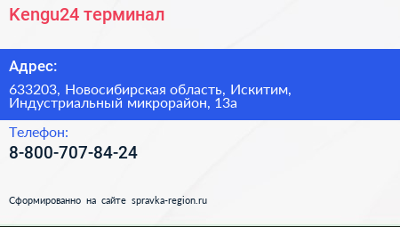 Kengu24, терминал по адресу 633203, Новосибирская область, Искитим, Индустриальный микрорайон, 13а в дальнейшем Организация, размещена в следующих категориях: