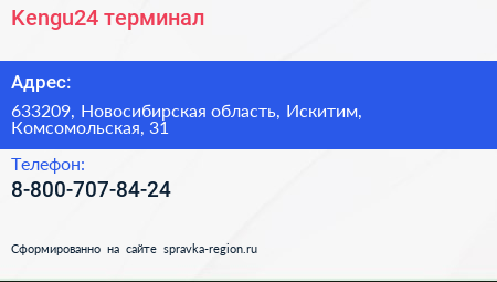 Kengu24, терминал по адресу 633209, Новосибирская область, Искитим, Комсомольская, 31 в дальнейшем Организация, размещена в следующих категориях:
