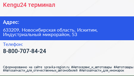 Kengu24, терминал по адресу 633209, Новосибирская область, Искитим, Индустриальный микрорайон, 53 в дальнейшем Организация, размещена в следующих категориях: