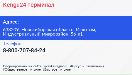 Kengu24, терминал по адресу 633209, Новосибирская область, Искитим, Индустриальный микрорайон, 56 к1 в дальнейшем Организация, размещена в следующих категориях: