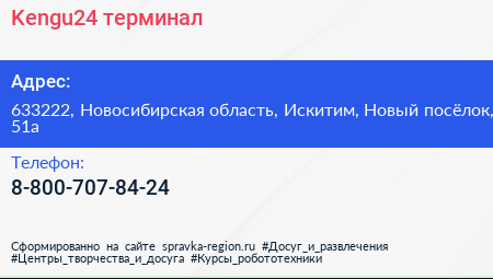 Kengu24, терминал по адресу 633222, Новосибирская область, Искитим, Новый посёлок, 51а в дальнейшем Организация, размещена в следующих категориях: