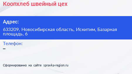 Коопхлеб, швейный цех по адресу 633209, Новосибирская область, Искитим, Базарная площадь, 6 в дальнейшем Организация, размещена в следующих категориях: