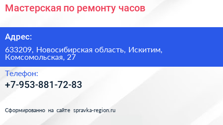 Мастерская по ремонту часов по адресу 633209, Новосибирская область, Искитим, Комсомольская, 27 в дальнейшем Организация, размещена в следующих категориях: