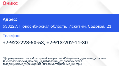 Оникс по адресу 633227, Новосибирская область, Искитим, Садовая, 21 в дальнейшем Организация, размещена в следующих категориях: