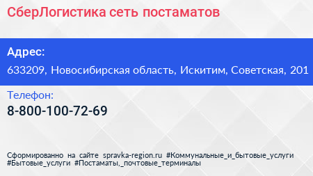 СберЛогистика, сеть постаматов по адресу 633209, Новосибирская область, Искитим, Советская, 201 в дальнейшем Организация, размещена в следующих категориях:
