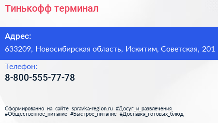 Тинькофф, терминал по адресу 633209, Новосибирская область, Искитим, Советская, 201 в дальнейшем Организация, размещена в следующих категориях: