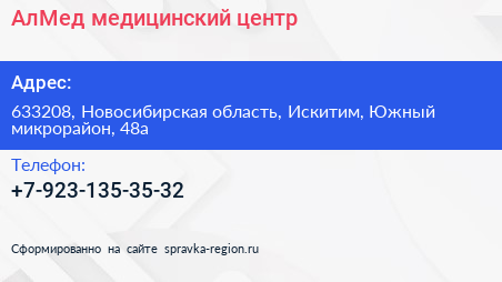 АлМед, медицинский центр по адресу 633208, Новосибирская область, Искитим, Южный микрорайон, 48а в дальнейшем Организация, размещена в следующих категориях: