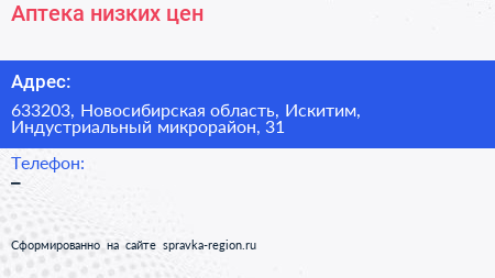Аптека низких цен по адресу 633203, Новосибирская область, Искитим, Индустриальный микрорайон, 31 в дальнейшем Организация, размещена в следующих категориях: