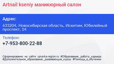 Artnail-kseniy, маникюрный салон по адресу 633204, Новосибирская область, Искитим, Юбилейный проспект, 14 в дальнейшем Организация, размещена в следующих категориях: