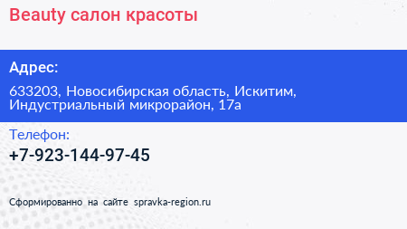 Beauty, салон красоты по адресу 633203, Новосибирская область, Искитим, Индустриальный микрорайон, 17а в дальнейшем Организация, размещена в следующих категориях: