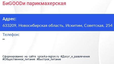 БиGOODи, парикмахерская по адресу 633209, Новосибирская область, Искитим, Советская, 254 в дальнейшем Организация, размещена в следующих категориях: