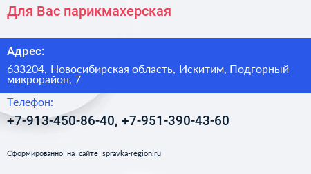 Для Вас, парикмахерская по адресу 633204, Новосибирская область, Искитим, Подгорный микрорайон, 7 в дальнейшем Организация, размещена в следующих категориях: